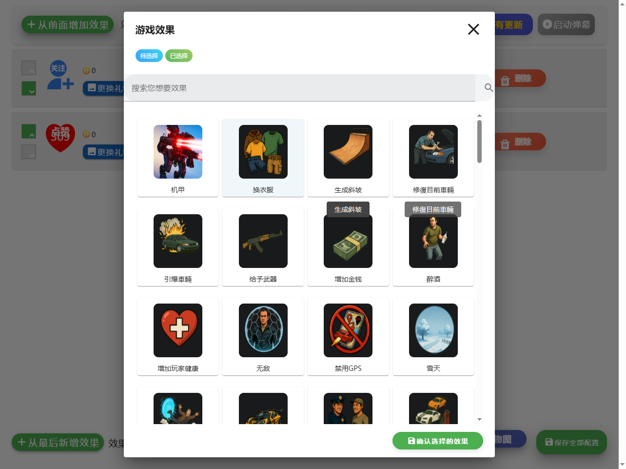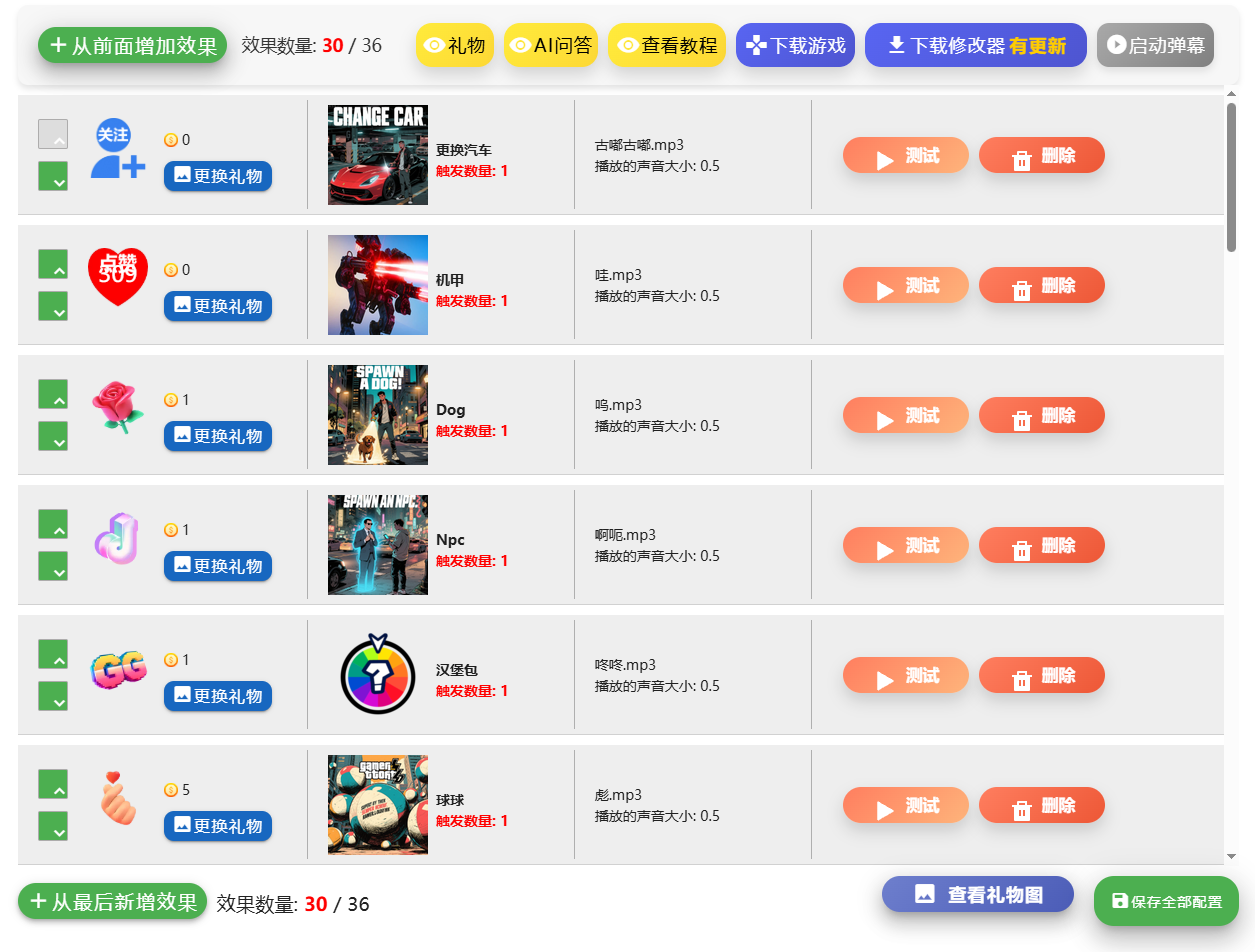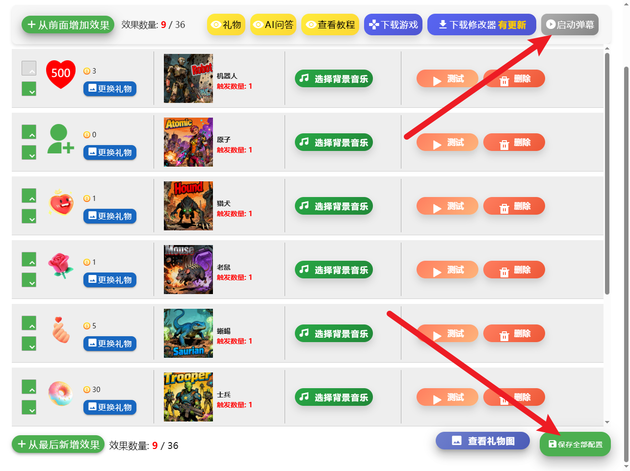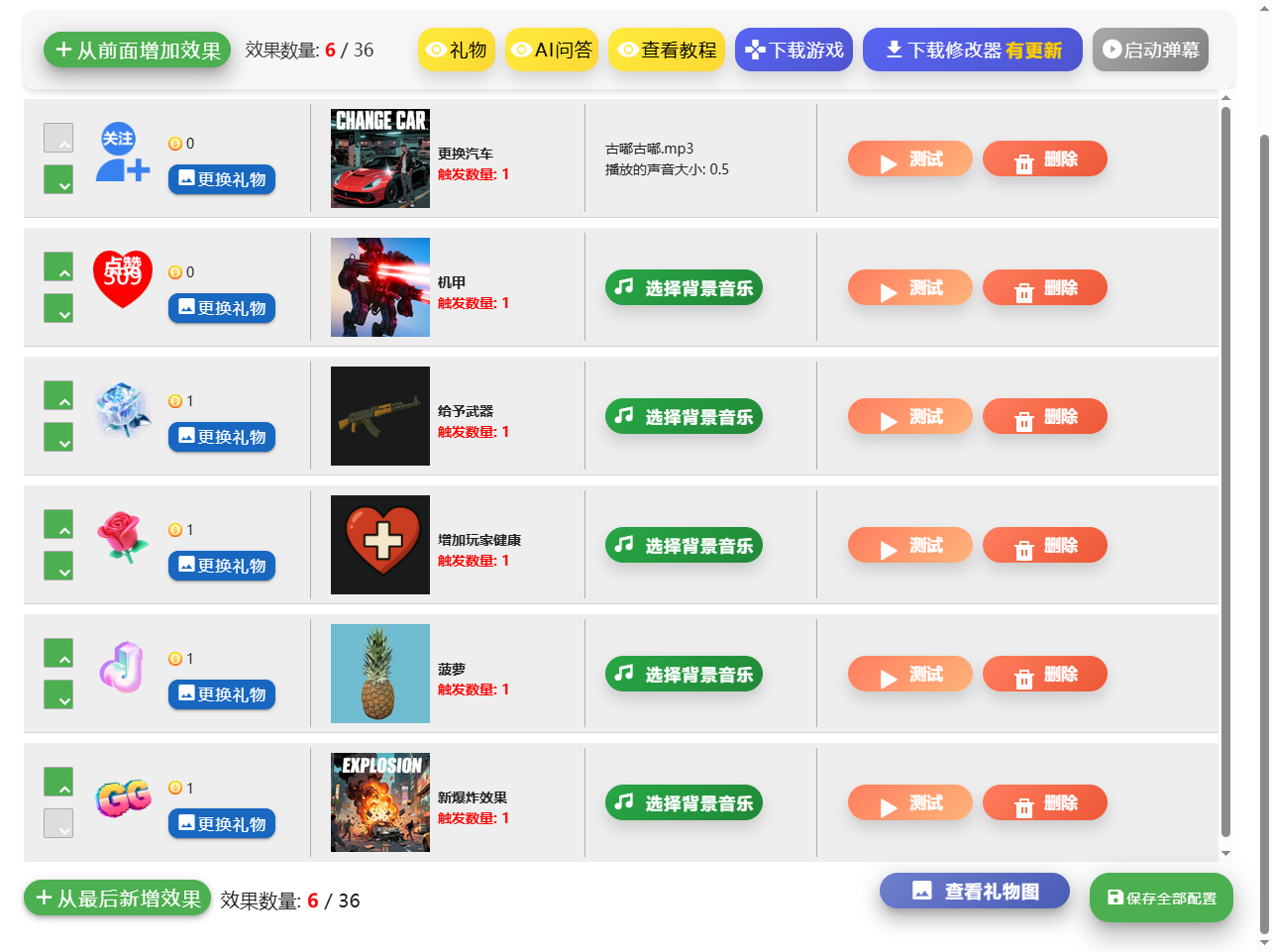删除:删除你添加的效果,需要点击最下面的保存全部配置按钮才会生效